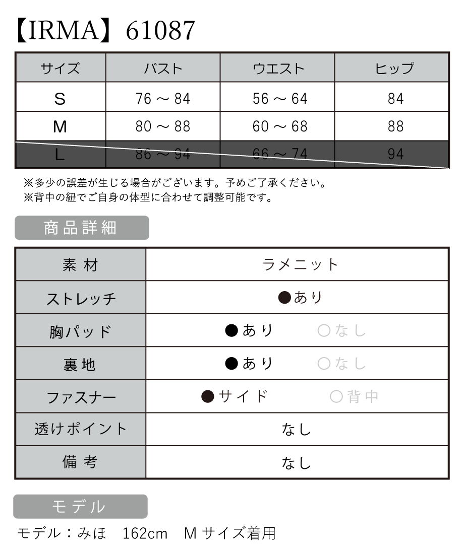B:76-84 / W:56-64 / H:84 [着丈](脇下)約140cm |