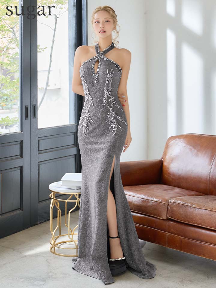 【IRMA/イルマ】グリッター/ スパンコール/ ビジュー/ パール/ ラメニット/ バストカットアウト/ スリット/ ホルターネック/ ストレッチ/ ロングドレス/ キャバドレス long[OF2A] [61087-IR-CHP-S260415]