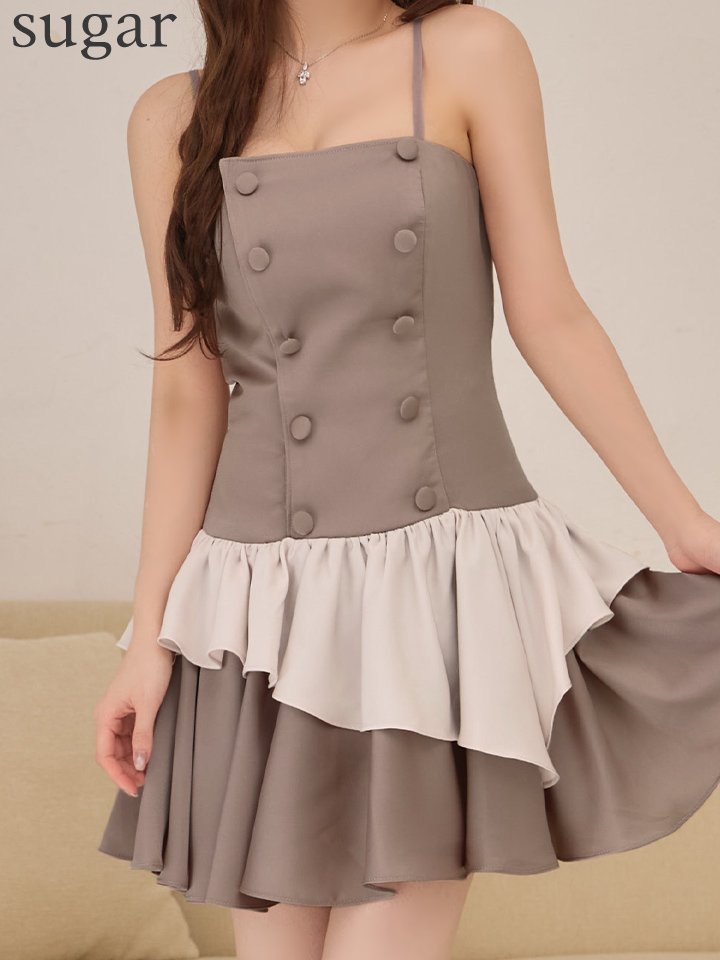 アシンメトリーに重ねたバイカラーのティアードフリルが可愛いフレアミニドレス♡