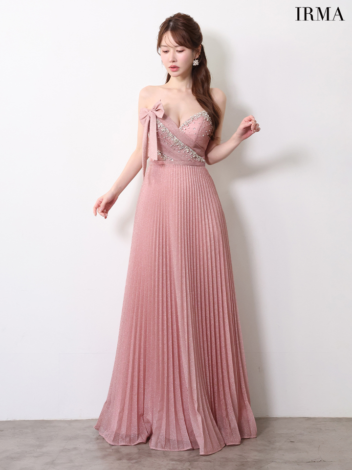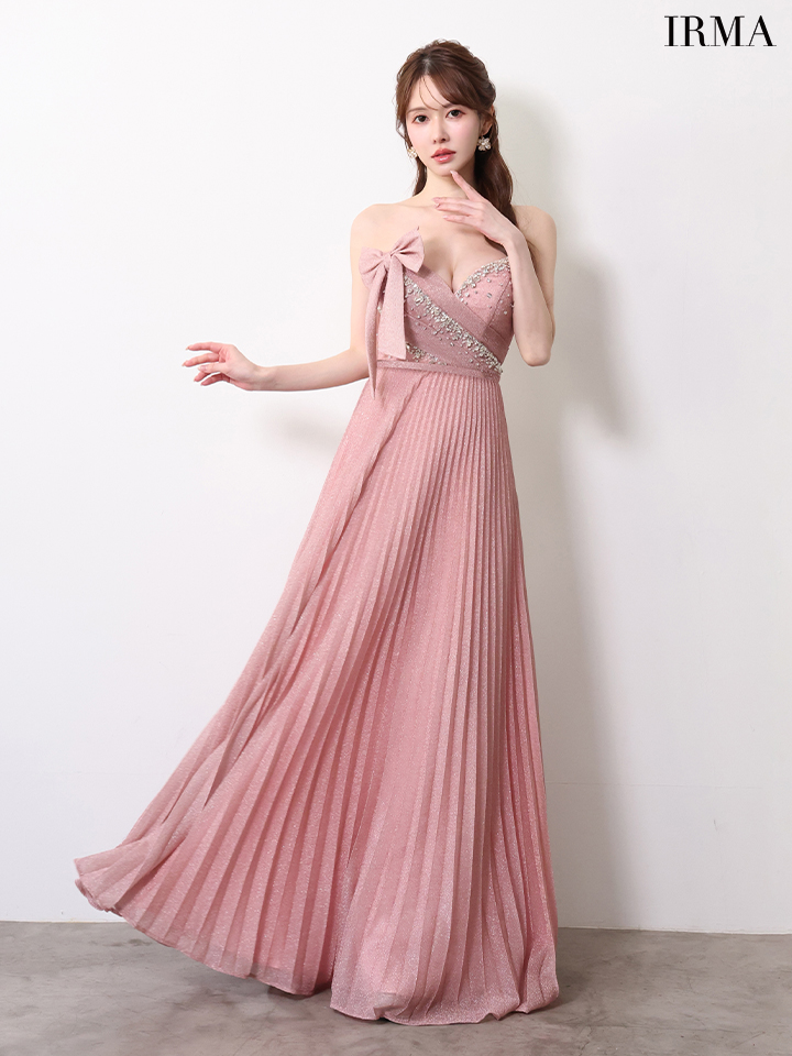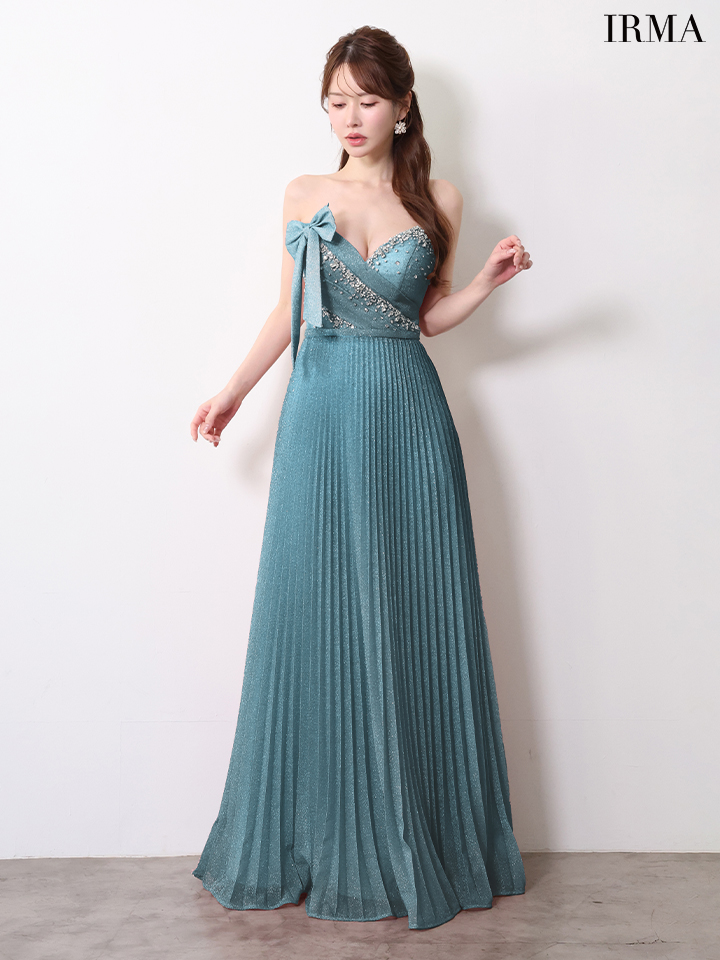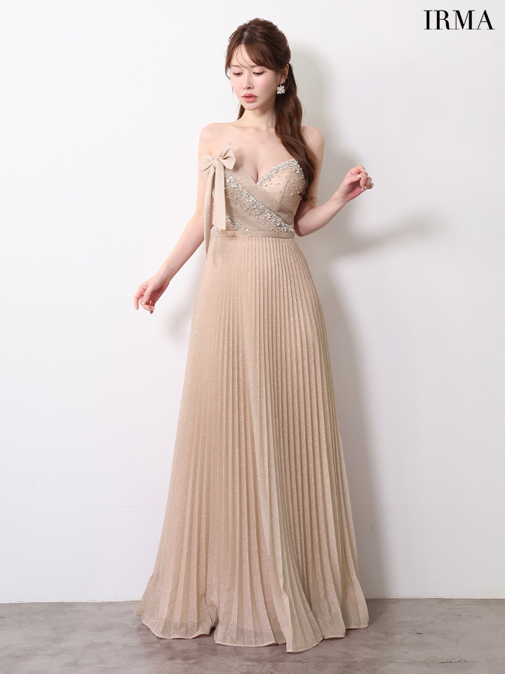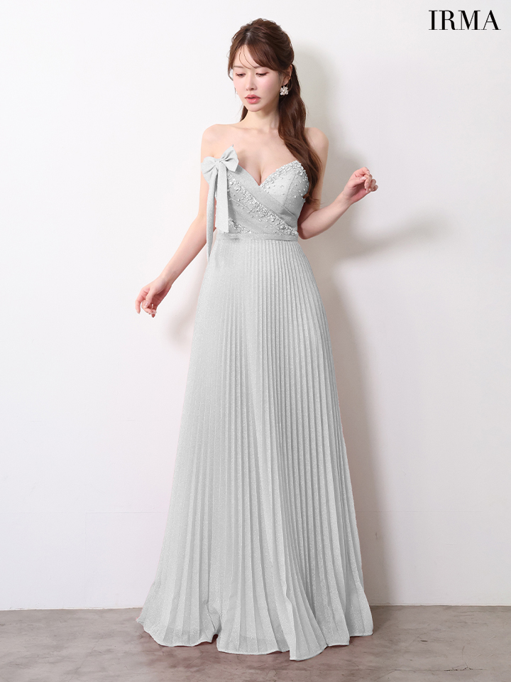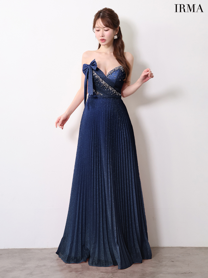 【IRMA/イルマ】ビジュー/ ハイウエスト/ ベア/ リボン/ ストレッチ/ タック/ ラメニット/ プリーツ/ ワンピース/ フレア/ ロングドレス/ キャバドレス long[OF2A] [61089-IR-DKBL-2604]