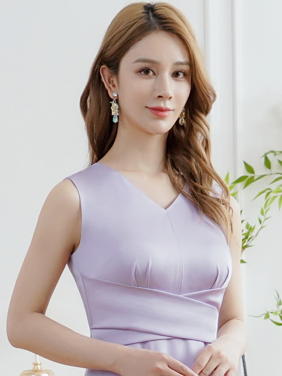 XS-Lサイズあり 【GINZA COUTURE/銀座クチュール】シンプル/ サテン/ Vネック/ ノースリーブ/ウエストマーク/ Aライン/ フレア/ ロングドレス/ キャバドレスlong[OF2] [LKC25182-PL-2604]