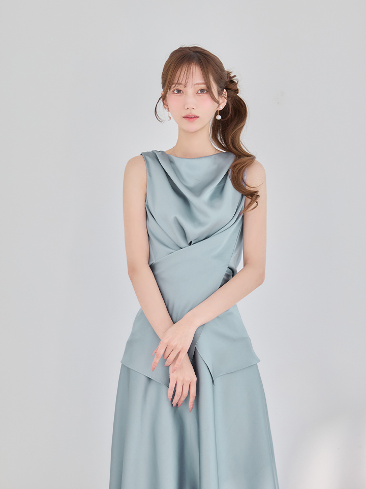 トップスはドレープデザインでデコルテを美しく引き立て、女性らしい柔らかさを演出。
