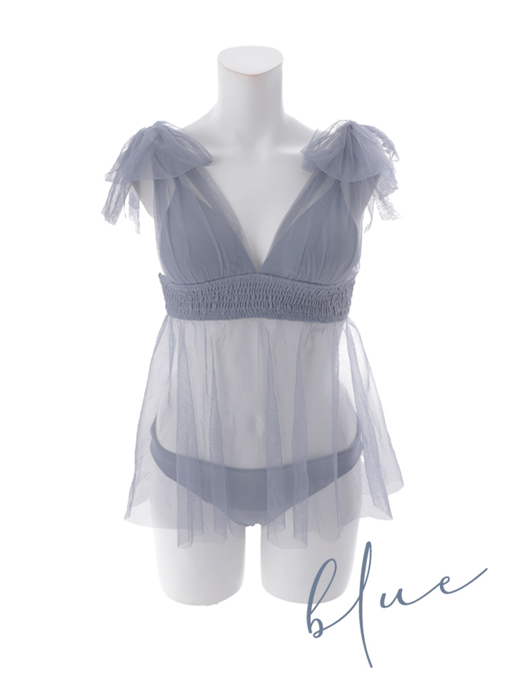 チュール生地がふんわり揺れる肩リボン付きトップスと、ブラが一体になったデザイン。