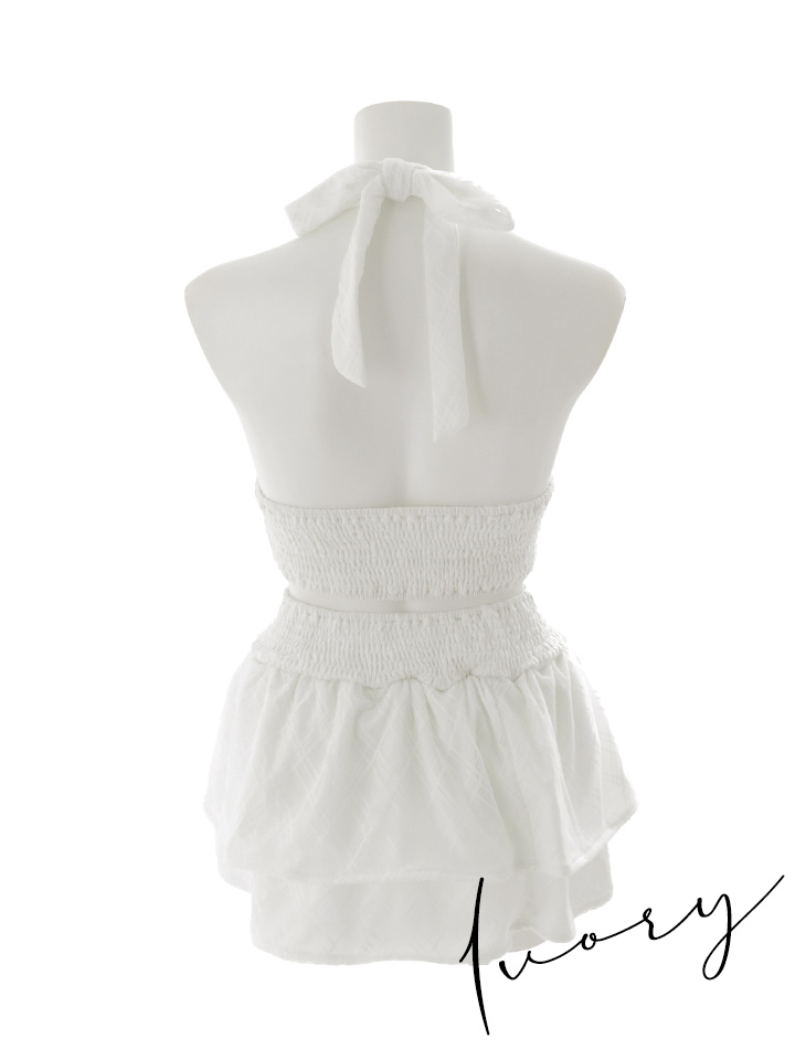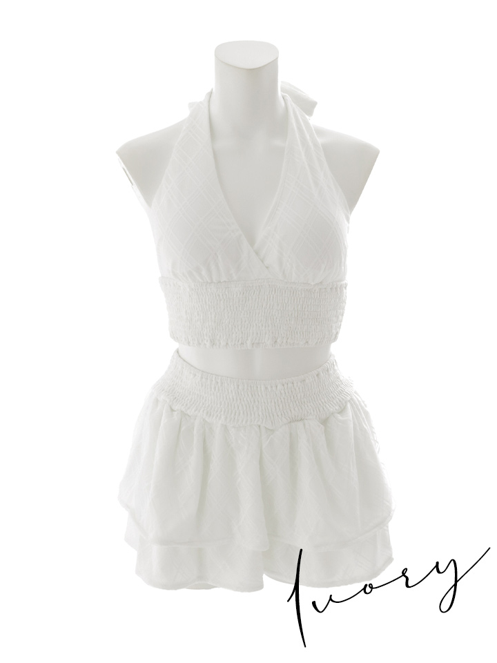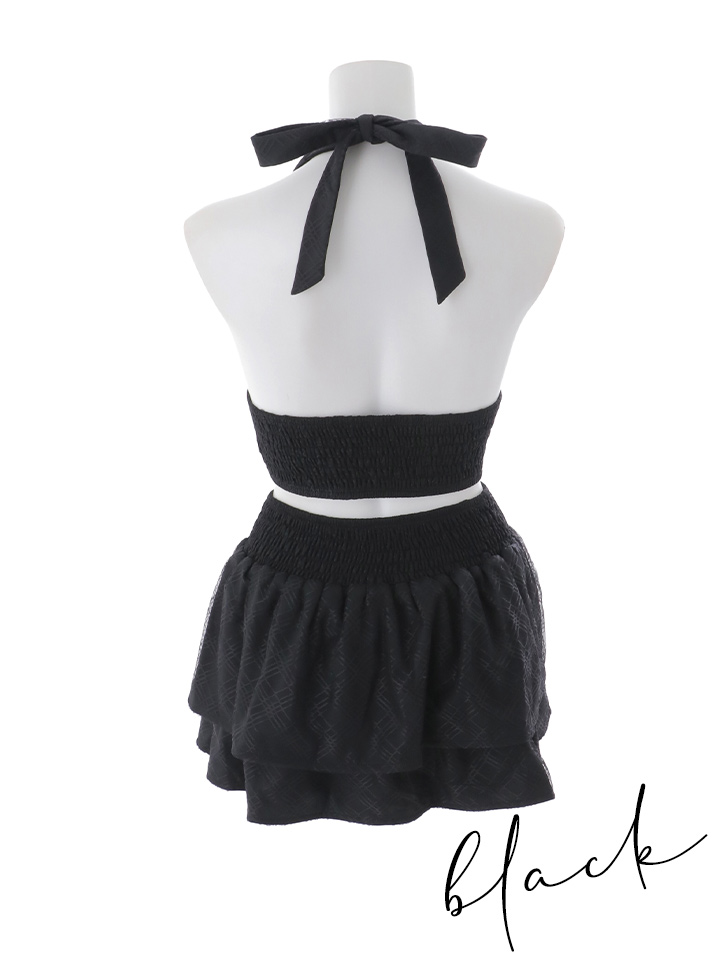 さりげないチェックレース生地が重なり、上品な立体感を演出するホルターネック水着。