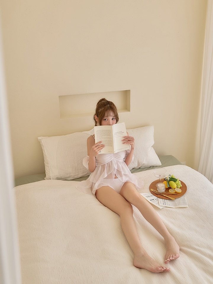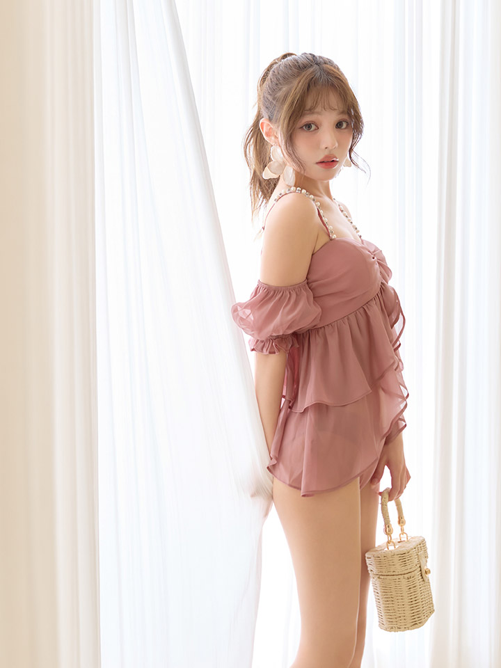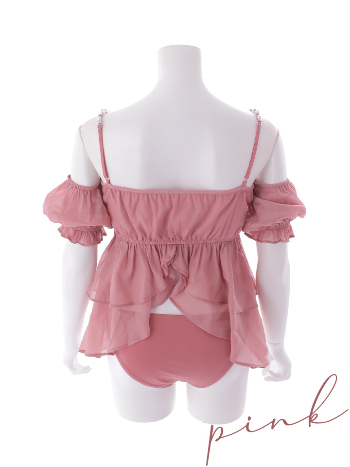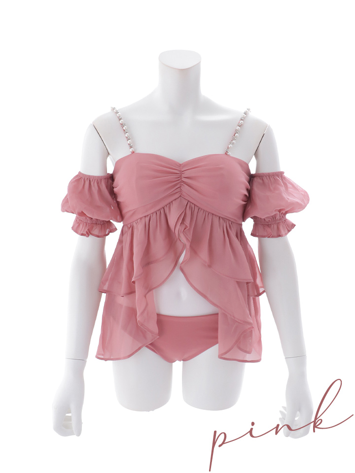 ふんわりとしたシフォン素材のフリルデザインが特徴で、肩のパールストラップが上品さをプラス。