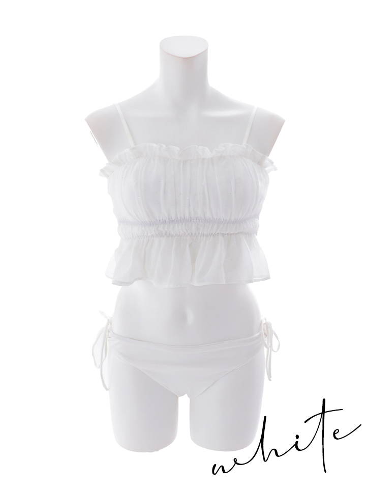 柔らかなシフォン生地が軽やかに揺れる、大人のためのベアトップスイムウェア。