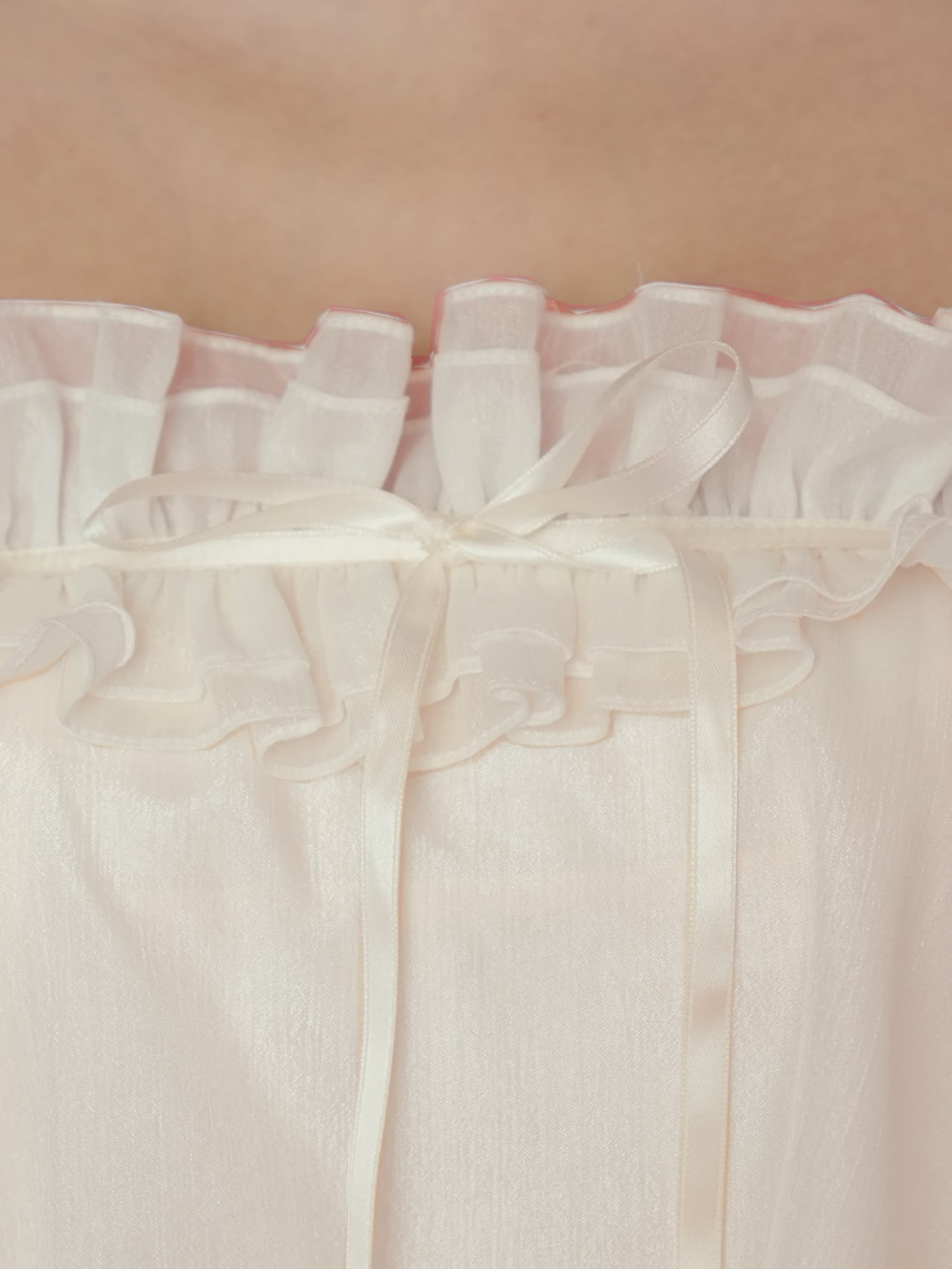 デコルテ部分のシアー切り替えと華奢なストラップが、上品な抜け感を演出します。