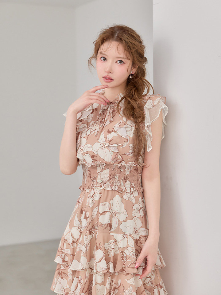 XS-Lサイズあり【SETTAN/セッタン】花柄/ シフォン/ フリルスリーブ/ プチハイネック/ ティアード/ Aライン/ ワンピース/ ミディアムドレス/ キャバドレス[OF2] [LKS161208-PxIV-S260424]