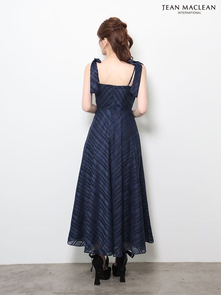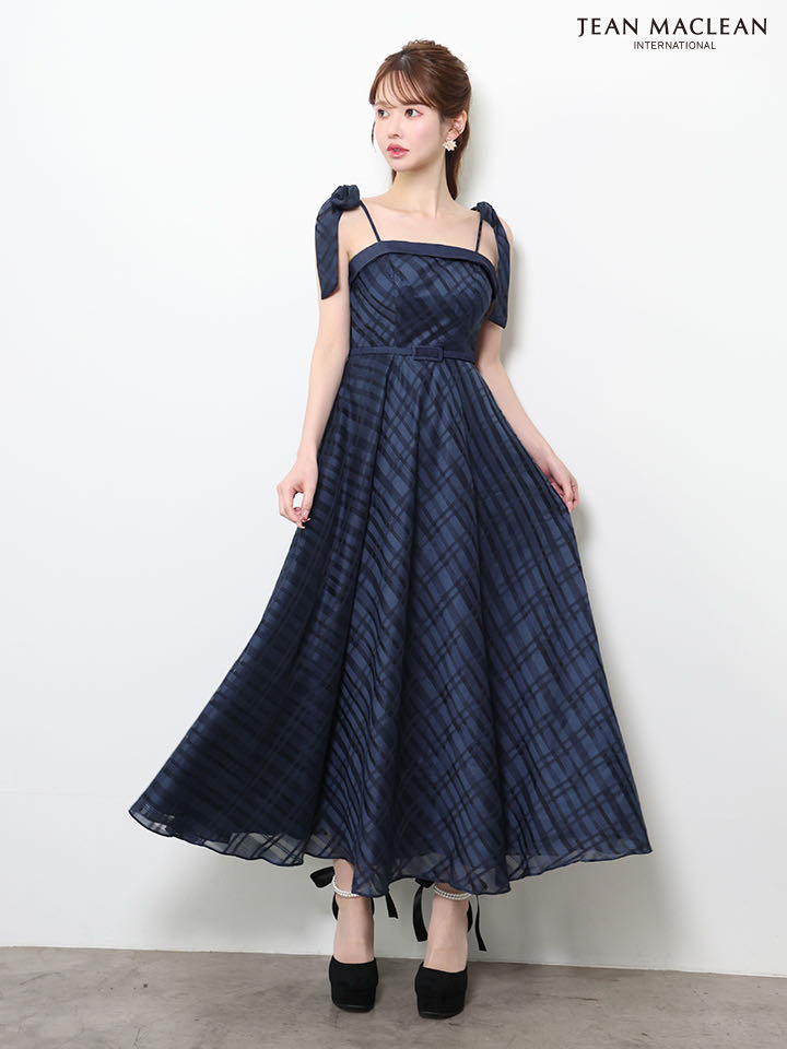 XSサイズあり【JEAN MACLEAN/ジャンマクレーン】オーガンジー/チェック/ ショルダーリボン/ ベルト/ キャミソール/ フレア/ ワンピース/ ミディアムドレス/ キャバドレス[OF2A] [61113-JM-NV-2604]