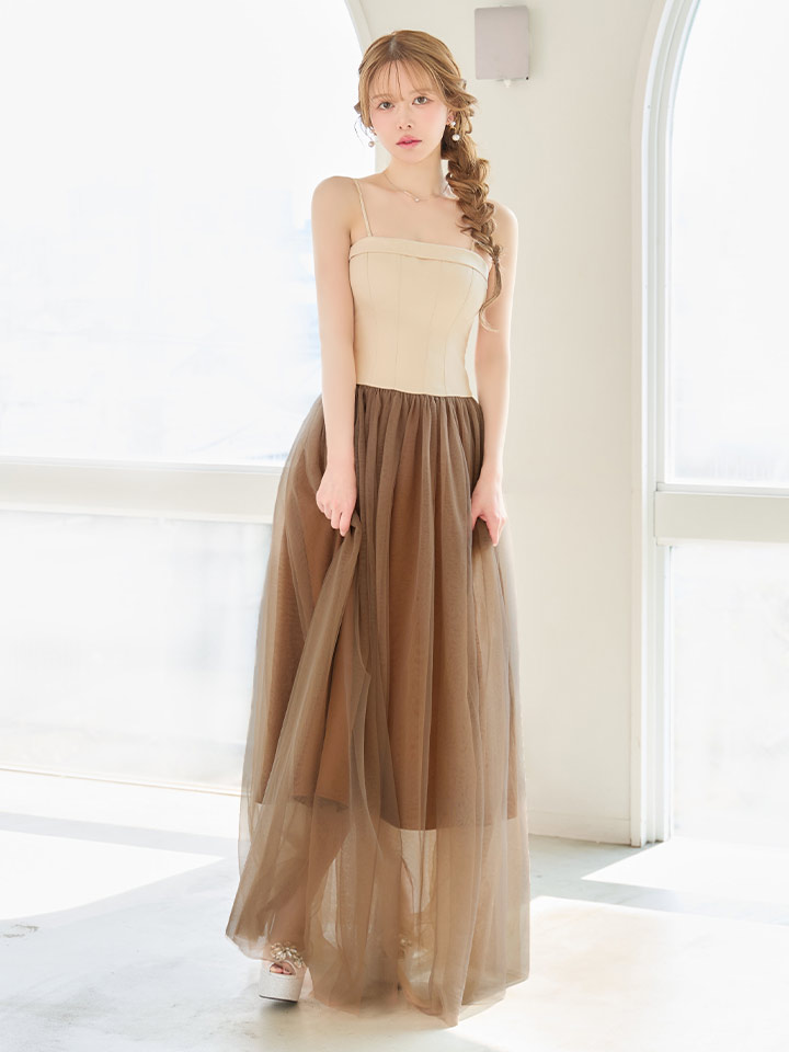 【予約商品/5月中旬発送予定】XSサイズあり【ANIER./アニエル】【ROBE de FLEURS/ローブドフルール】chic corset couture long dress/ バイカラー/ チュール/ 2way/ ベア/ フレア/ ワンピース/ ミディアムドレス/ キャバドレス[OF08] [ANIER4071-BExP-S260424]