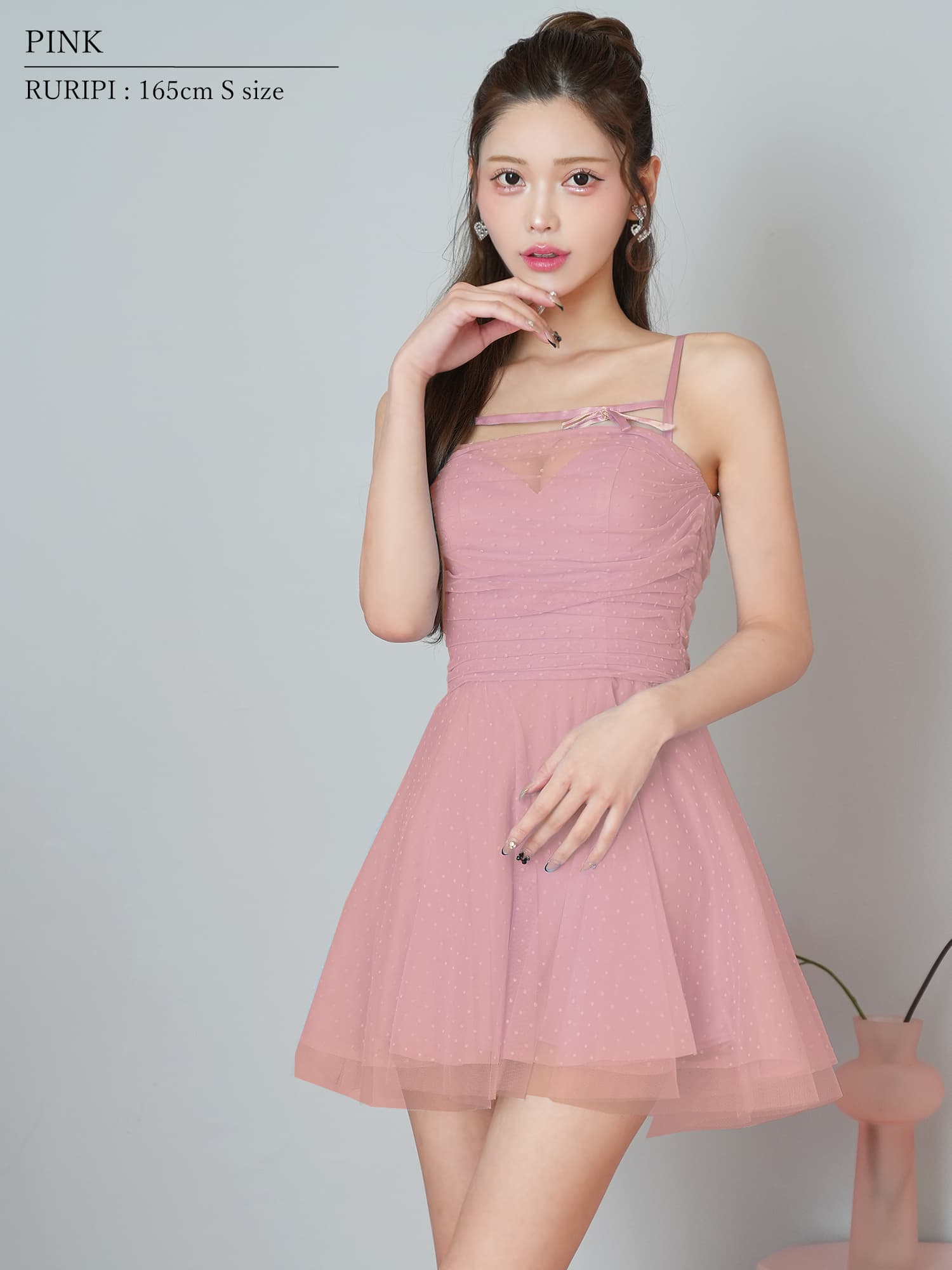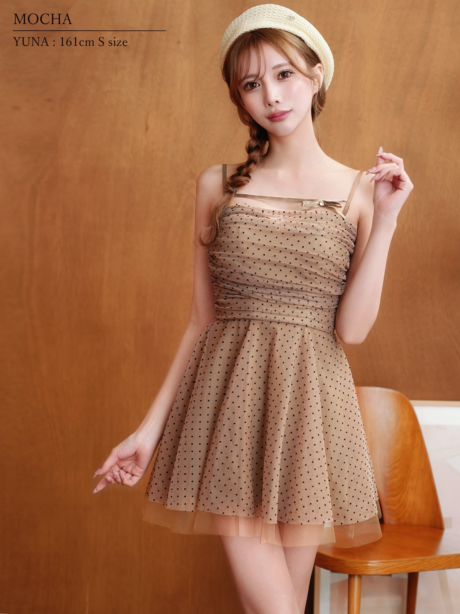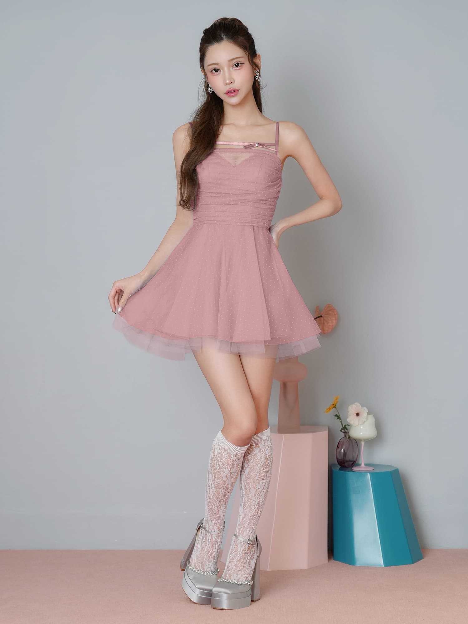 繊細なドットチュールを重ねた、軽やかでフェミニンなキャミドレス。