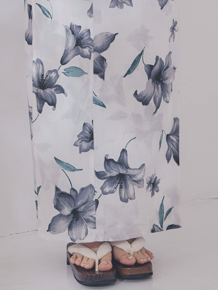上品に描かれた青い百合柄が優しげな印象に