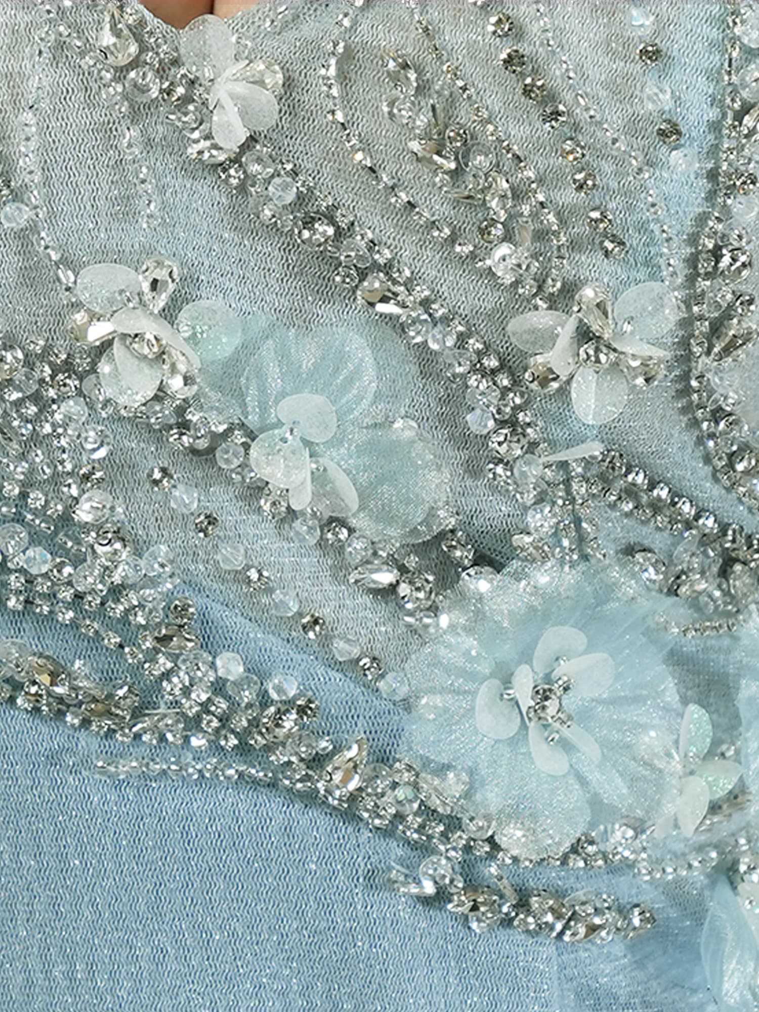 胸元に広がるフラワーモチーフと繊細な装飾が、視線を集めるラグジュアリーなデザイン。