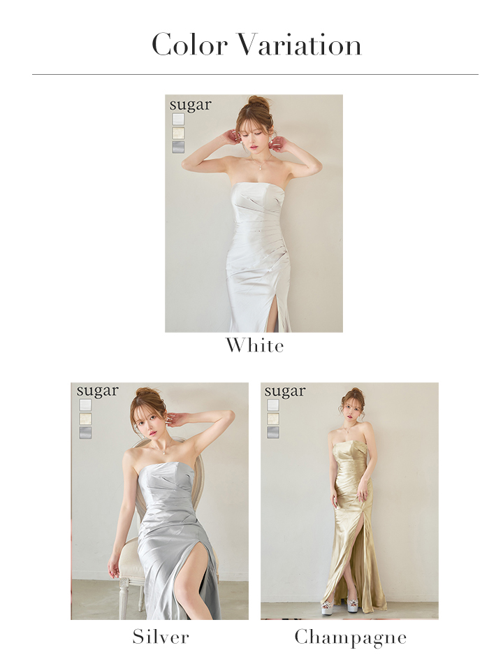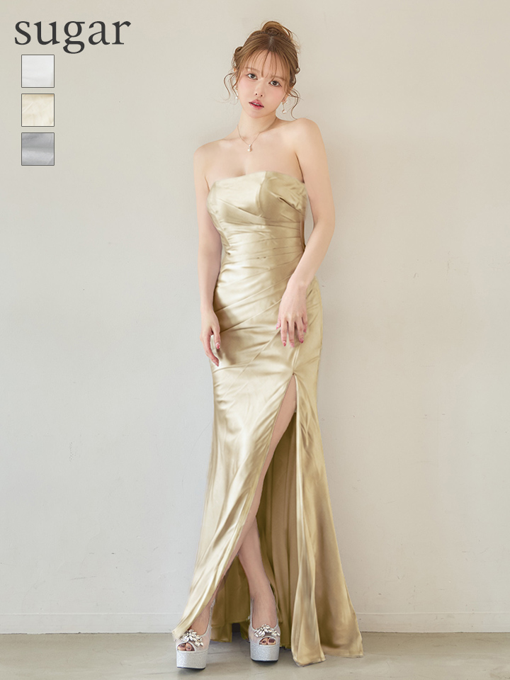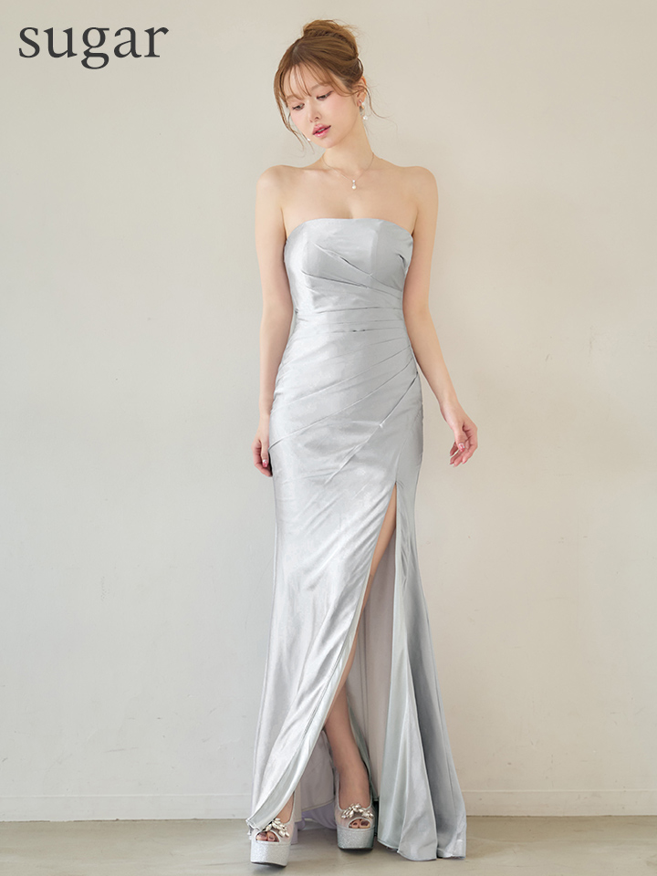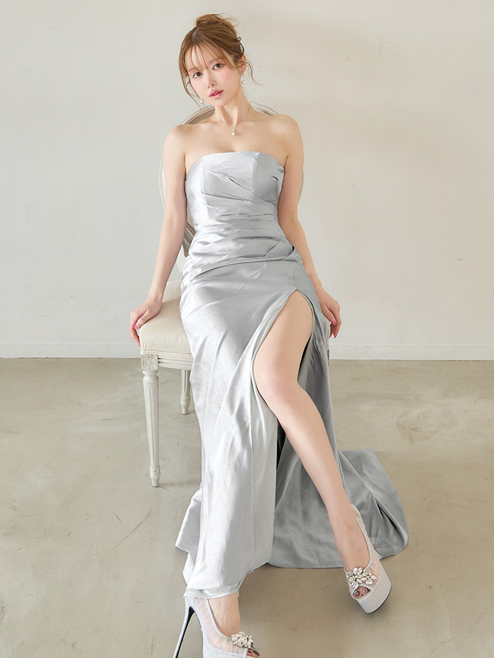 ベアデザインがデコルテラインを美しく強調し、ロングスリットで美脚アピールも◎