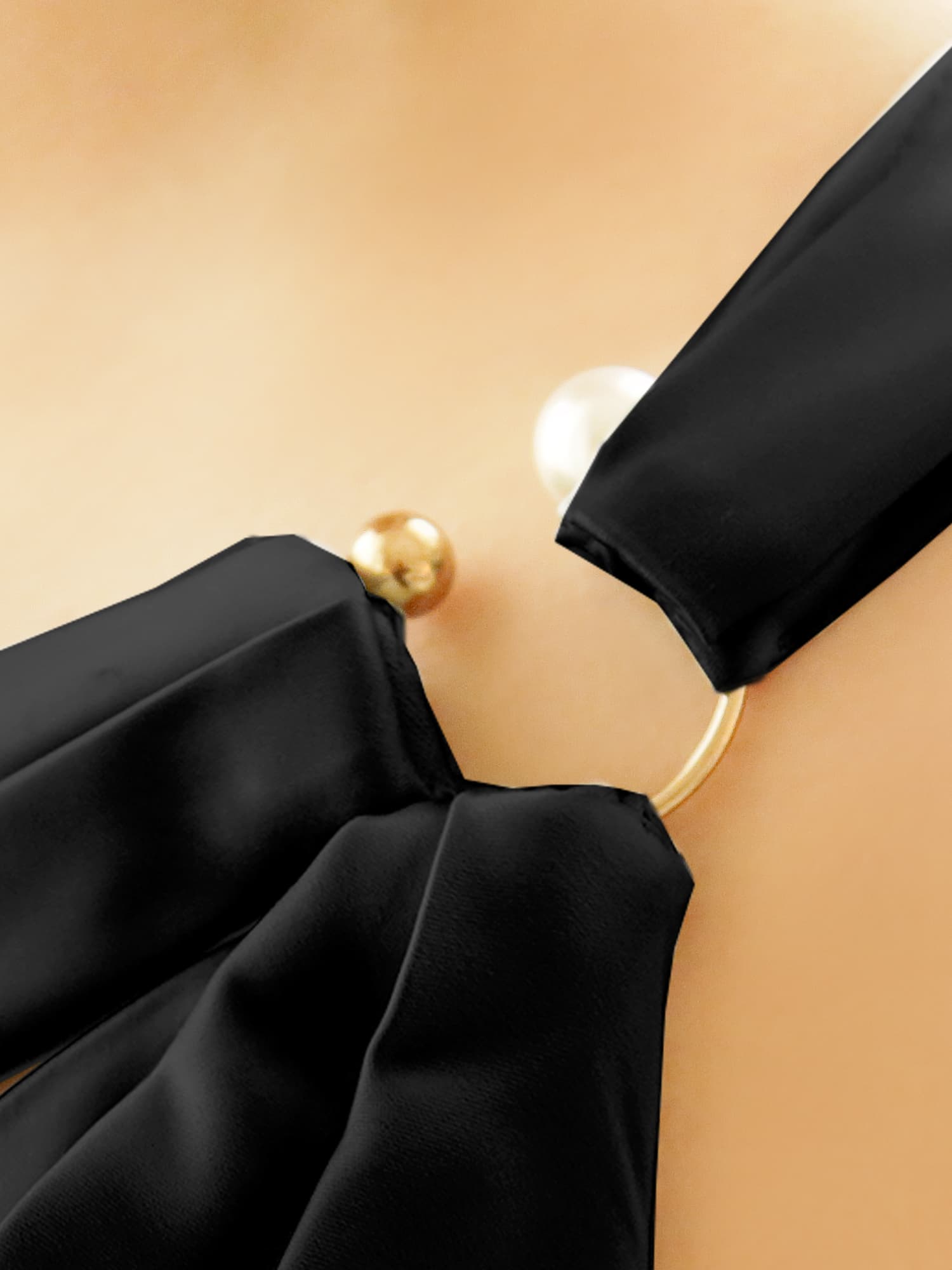 胸元のカットデザインと斜めラインのドレープが視線を集め、スタイルアップ効果も◎