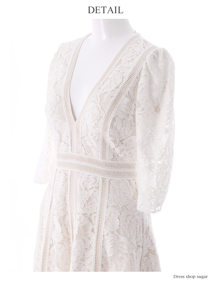 門りょうちゃん着用【XS-Lサイズあり】【SETTAN/セッタン】総レース/ 袖あり/ 七分袖/ Vネック/ Aライン/ ミディアム丈/ ワンピース/ ミニドレス/ キャバドレス[OF2] [LKS32088S-W-S2106]
