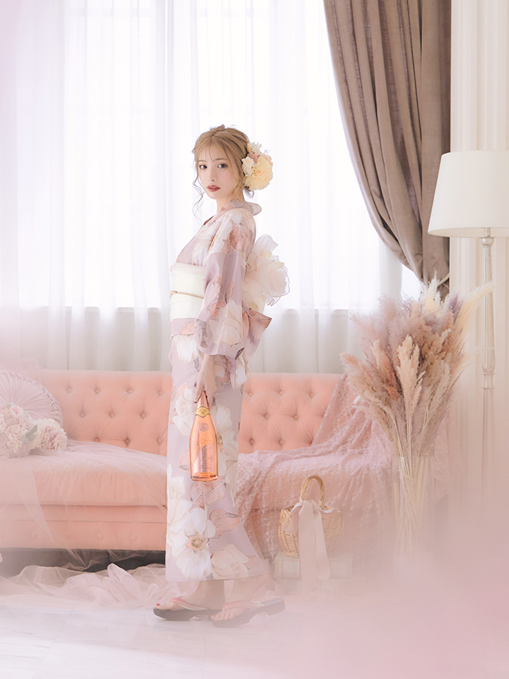 大人ガーリーな絶妙なピンク地に可憐な花が咲き誇り、