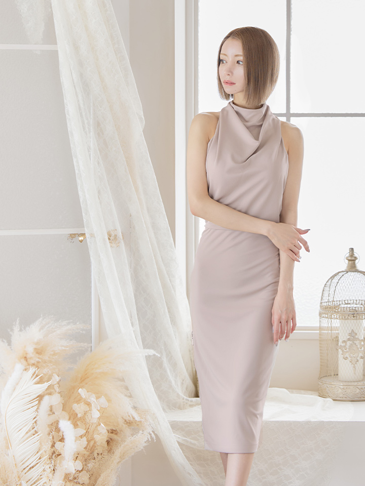 ハイネックデザインにモダンテイストな無地ボディーが大人の印象奏でるタイトドレス。