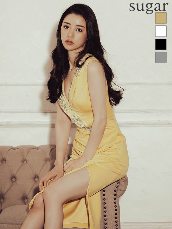 XSサイズあり【Veautt/ヴュート】【OF05】ビジュー/ アシメ襟/ スリット/ Vネック/ ストレッチ/ ひざ丈/ ミディアム/ タイト/ キャバドレス [VT06223-YE-S2208]