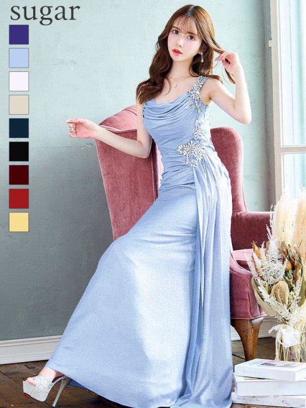 L・XL・XXLサイズあり【UNA VALERIE / ウナヴァレリェ】 ドレープデザイン/ ビジュー/ バックスピンドル/ ロングドレス/ キャバドレス[OF05] [V32957L-Sky-S2209]