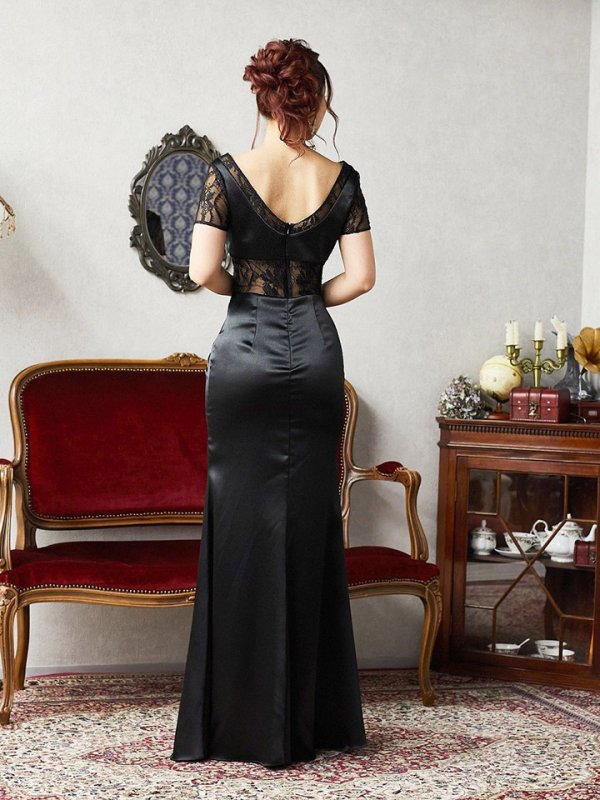 Lサイズあり【Luxe Style/リュクススタイル】マーメイド/ レース/ ビジュー/ スリット/ ハーフスリーブ/ 袖あり/ ロングドレス/ キャバドレス long【HC03】 [19027-W-F-2209]