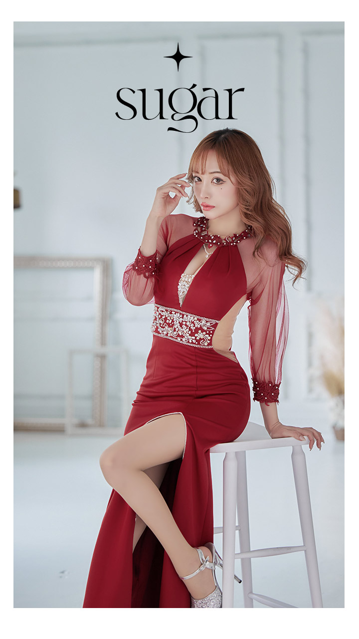 【ANGEL R/エンジェルアール】長袖/ 袖あり/ アメスリ/ フラワーデザイン/ パール/ ビジュー/ スリット/ ストレッチ/ タイト/ ロング/ キャバドレスlong[OF2] [AR22821-R-S2210]