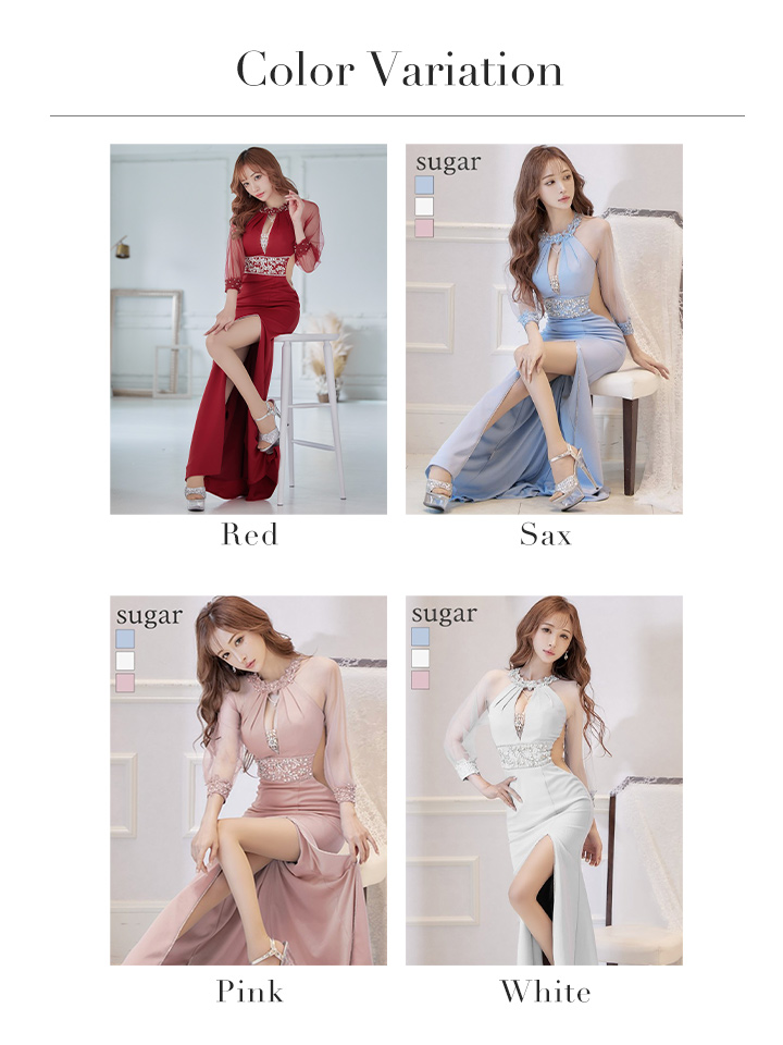 大人気のシアーロングスリーブ&フラワー刺繍のホルターネックが掛け合わさったタイトロングドレス。