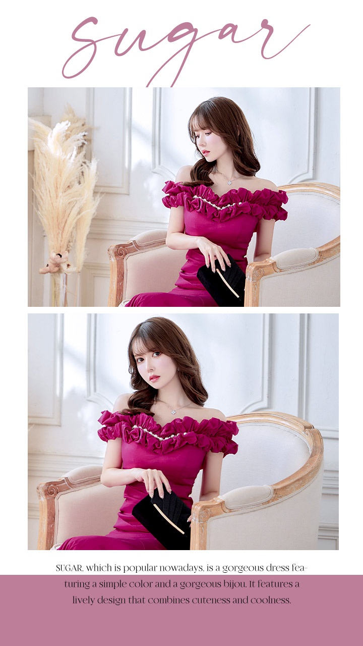 ボリュームのあるフリルデザインが大人可愛いマーメイドロングドレス