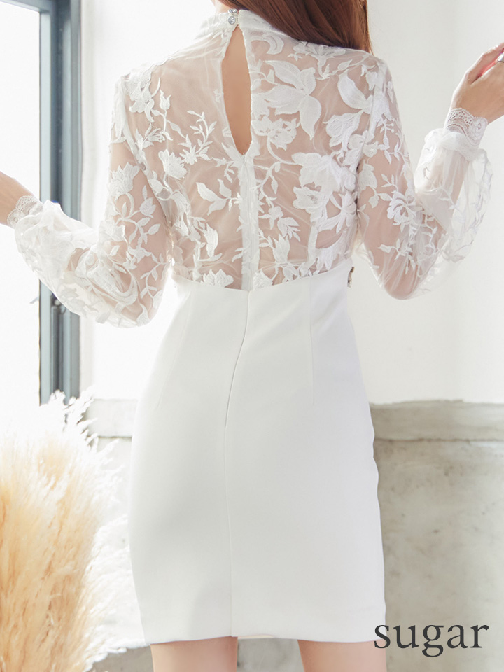 繊細なデザインレースがラグジュアリーなワンカラーミニドレス