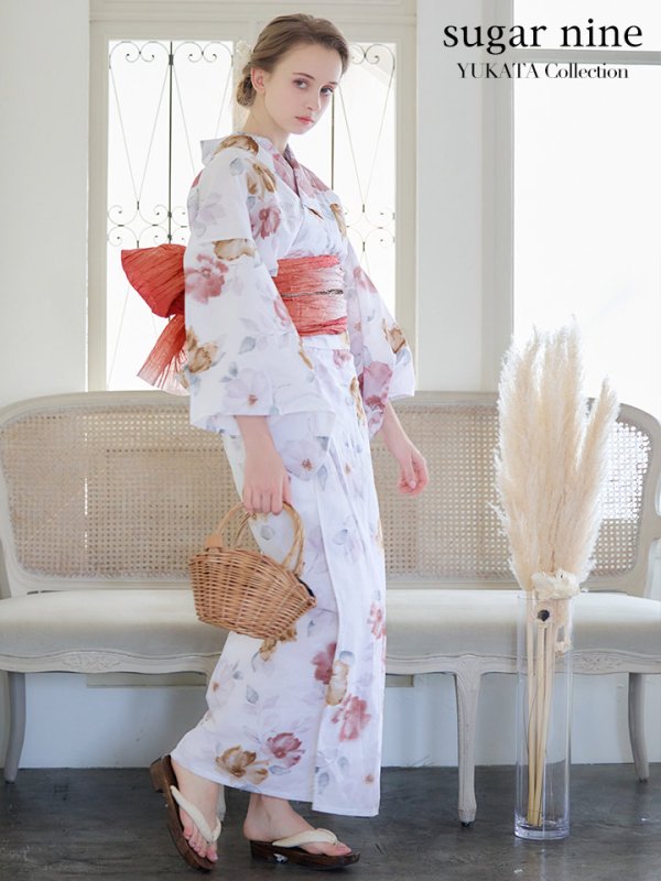 【即日発送】【浴衣】白地x暖色椿浴衣【浴衣3点セット 浴衣/帯/下駄】[YMT] [Y-7037-kj-W-F-23KE]