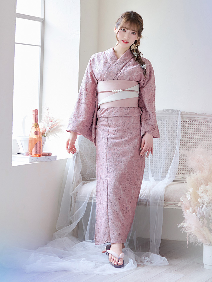 【即日発送】ダスティピンクのレース浴衣【浴衣3点セット 浴衣/帯/下駄】[YMT] [Y-7104-ok-DusP-F-23sou]