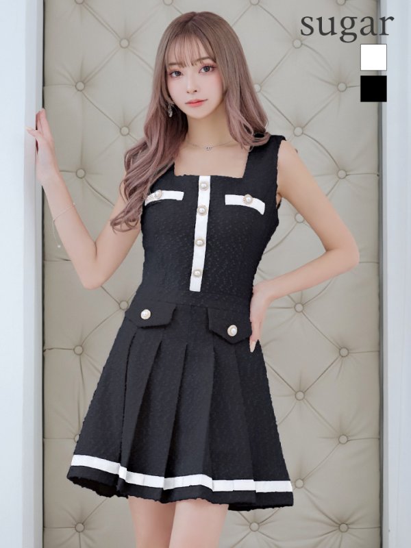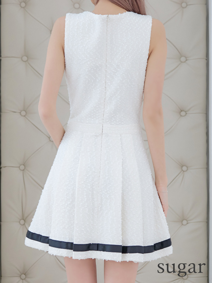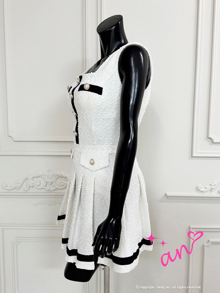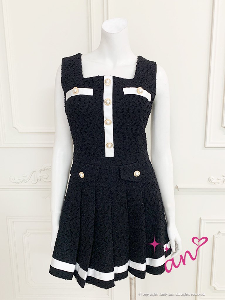 【an/アン】ツイード/ ストレッチ/ プリーツ/ バイカラー/ ボタン/ フレア/ミニドレス/ キャバドレス[OF05] [AOC3406-B-S230227]