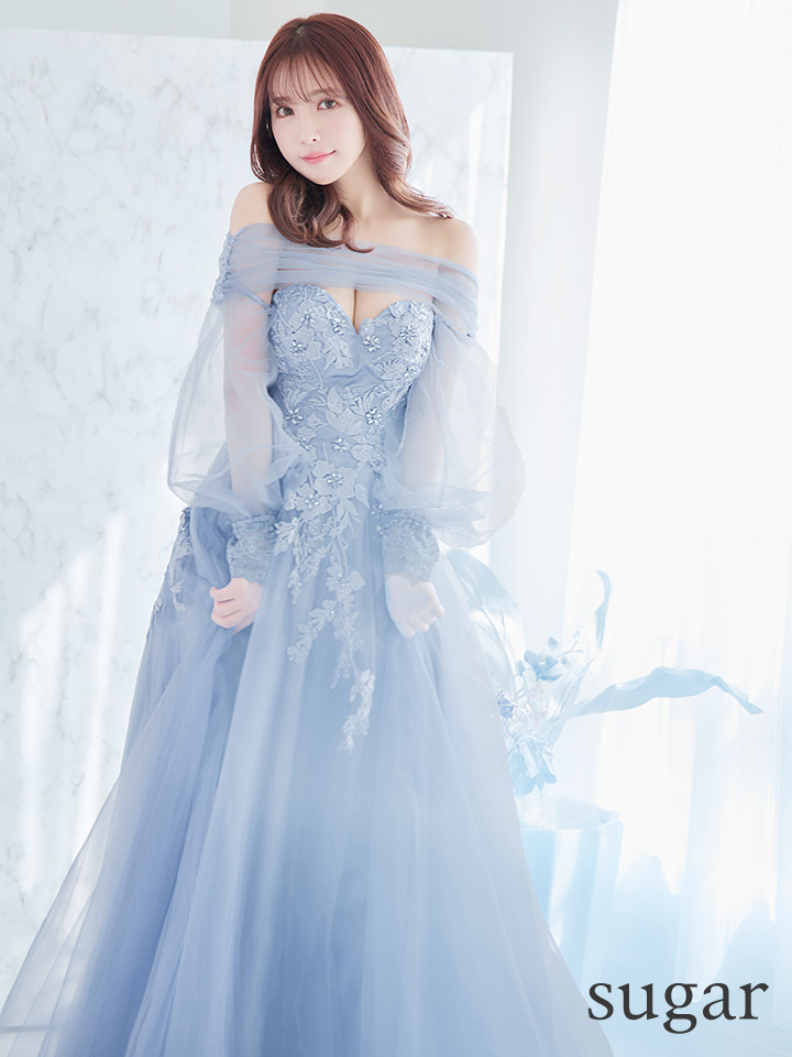 Lサイズあり【JEAN MACLEAN/ジャンマクレーン】ベア/ オフショル/ 2way/ ショールスリーブ/ 袖あり/ 立体フラワー刺繍/ ラメ/ プリンセス/ ロングドレス/ キャバドレス long[OF2A] [31285-JM-BL-S2303]