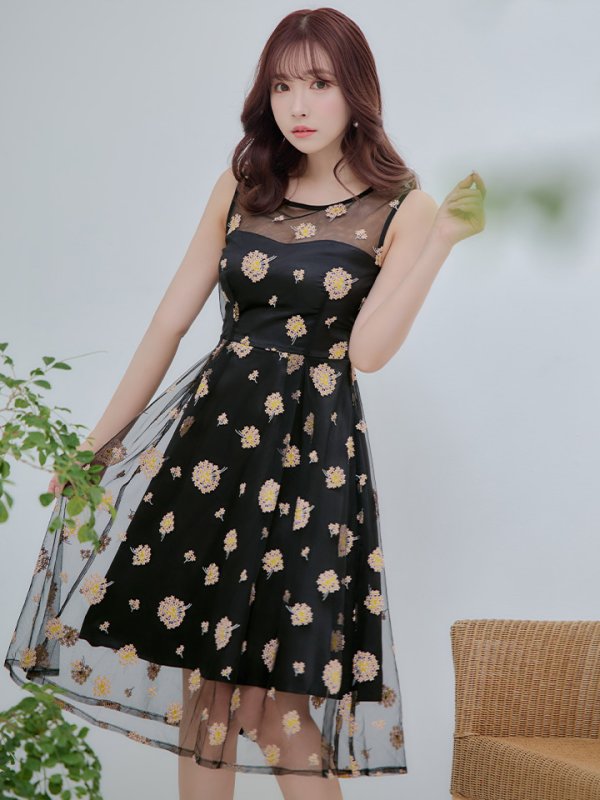 大人ガーリーなフラワー刺繍が施されたチュールワンピースドレス♡