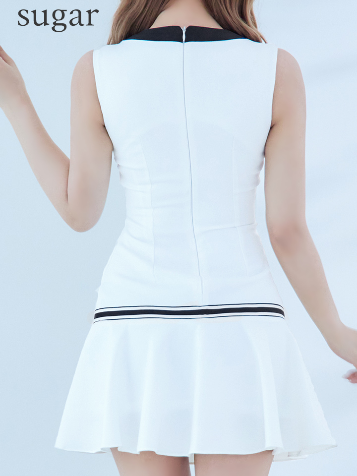 【an/アン】スクエアネック/ バイカラー/ ボタン/ 裾フリル/ フレア/ ミニドレス/ キャバドレス[OF05] [AOC3404-W-S230407]
