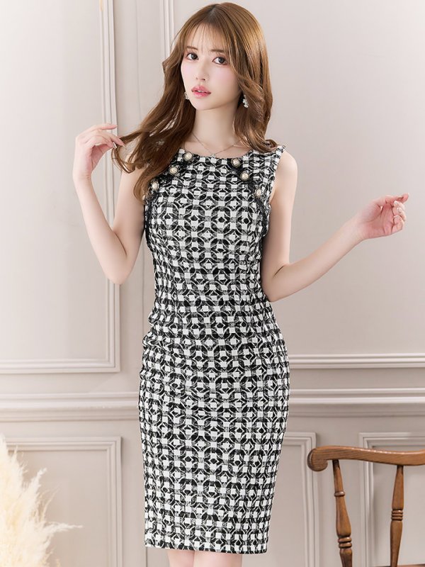 【VANESSA HEART / ヴァネッサハート】【OF05】 ワンピース/ ギンガムチェック/ チェック柄/ レース/ スリット/ ノースリーブ/ 膝丈/ タイト/ ミディアム丈/ キャバドレス [H9830H-B-S2304]