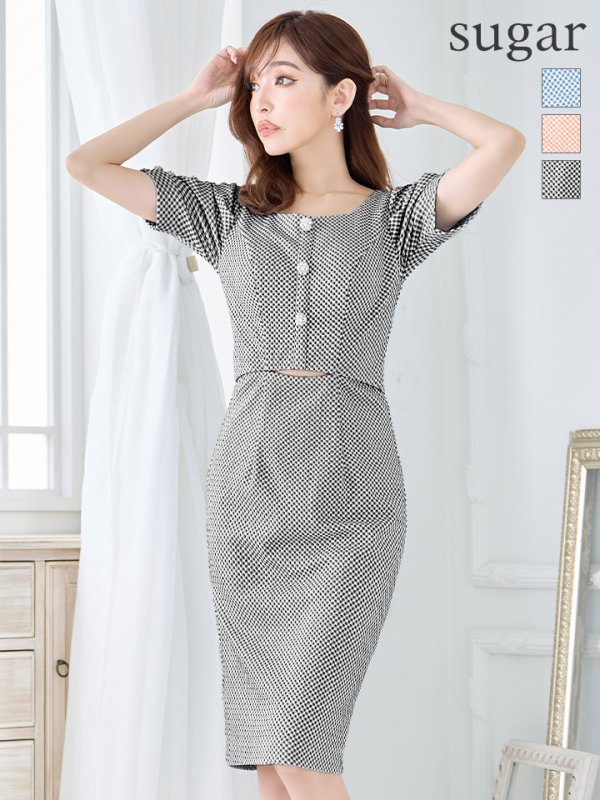 Lサイズあり【JEAN MACLEAN/ジャンマクレーン】チェック柄ニット/ ストレッチ/ ボタン/ カットアウト/ 半袖/ 袖あり/ パフスリーブ/ タイト/ ひざ丈/ ミディアムドレス/キャバドレス【HC02】 [35854-JM-B-S230603]