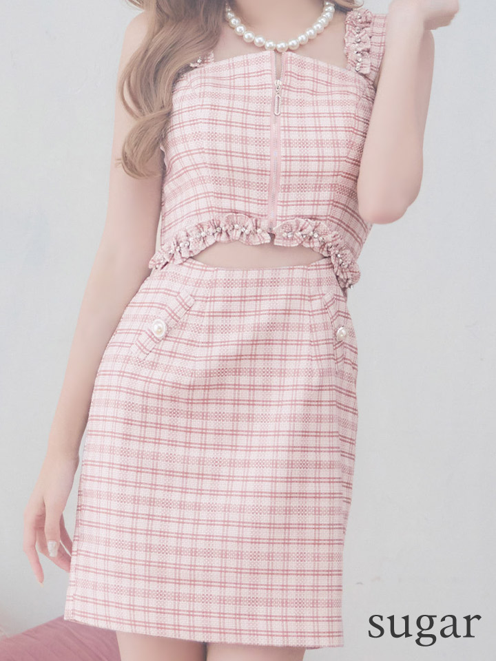 立体感のあるフリルデザインとチェックツイードがキュートに目を惹くタイトドレス