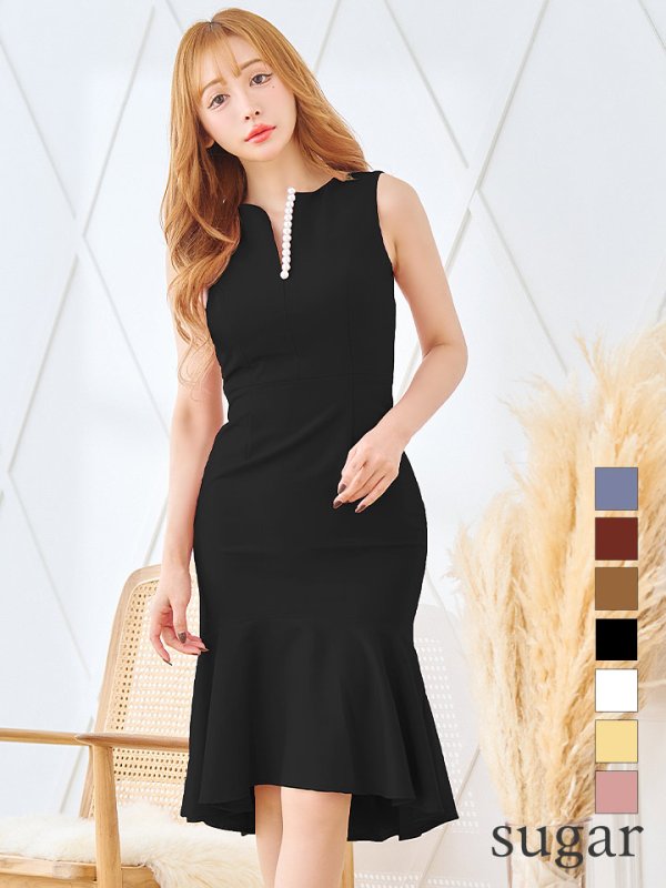 【VELIQUE/ヴェリーク】ワンカラー/ パール/ ノースリーブ/ 裾フリル/ マーメイド/ ワンピース/ ひざ丈/ ミディアムドレス/ キャバドレス【HC02】 [BYRS-161-B-S2308]