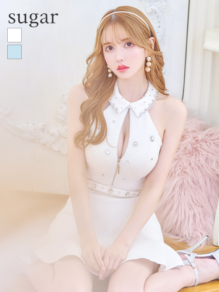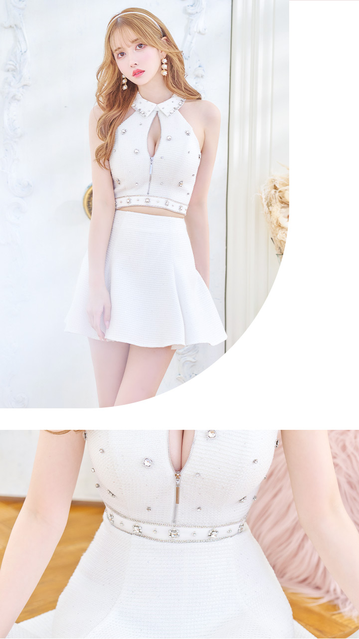 XSサイズあり【ROBE de FLEURS/ローブドフルール】ツイード/ ジップ/ 襟付き/ ホルター/ ビジュー/ フレア/ セットアップ/ ミニドレス/ キャバドレス[OF08] [fm2891-W-S230908]