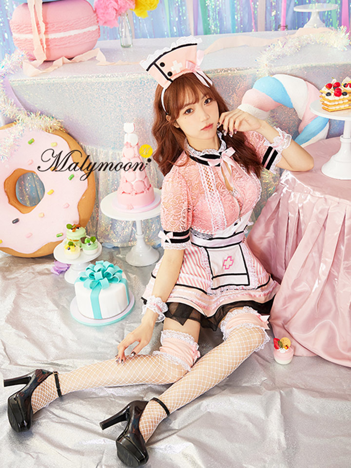 花柄レース×ストライプが大人かわいいライトピンクのナースコスチュームは、 フロントジッパーで肌の見え感を調節できる嬉しい仕様。
