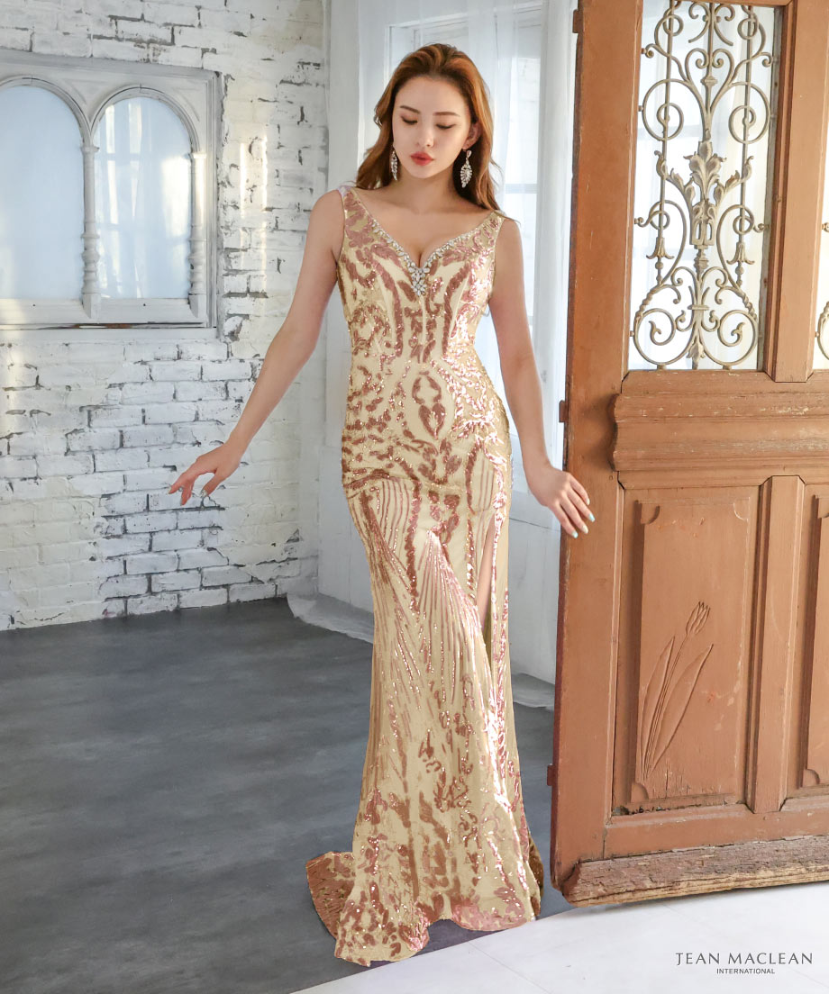 Lサイズあり【JEAN MACLEAN/ジャンマクレーン】スパンコール刺繍/ ロングスリット/ ノースリーブ/ Vネック/ スピンドル/ ロングドレス/ キャバドレスlong[OF2A] [31338-JM-W-S230921]
