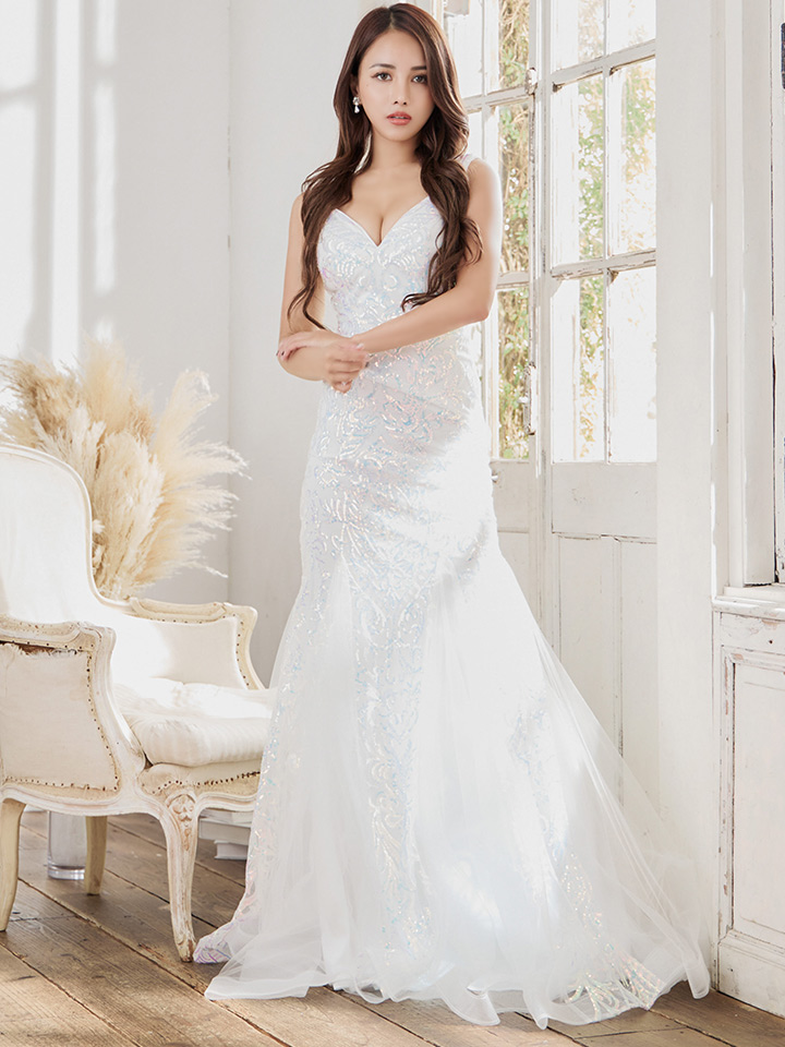 【JEAN MACLEAN/ジャンマクレーン】マーメイド/ スパンコール刺繍/ ノースリーブ/ Vネック/ ネットレース/ スピンドル/ ロングドレス/ キャバドレスlong[OF2A] [31361-JM-W-S2309]