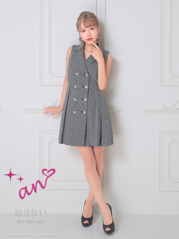 【an/アン】襟付き/ ストレッチ/ パールボタン/ ジャケット風/ ノースリーブ/ プリーツ/ フレア/ ワンピース/ ミニドレス/ キャバドレス[OF05] [AOC3389-BW-2310]