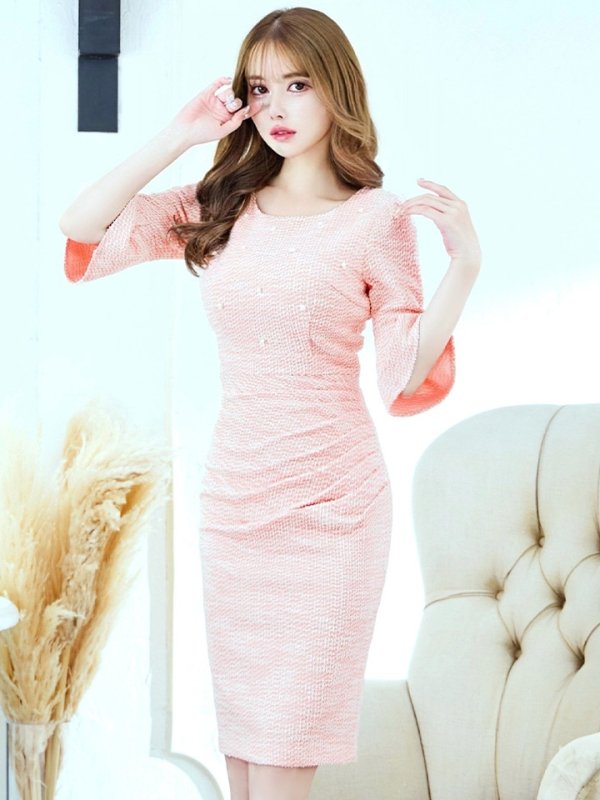 Lサイズあり【VANESSA HEART / ヴァネッサハート】【OF05】ツイード/ パール/ 袖あり/ 七分袖/ タイト/ ひざ丈/ ミディアムドレス/ キャバドレス [H60067H-PeachIV-S2311]