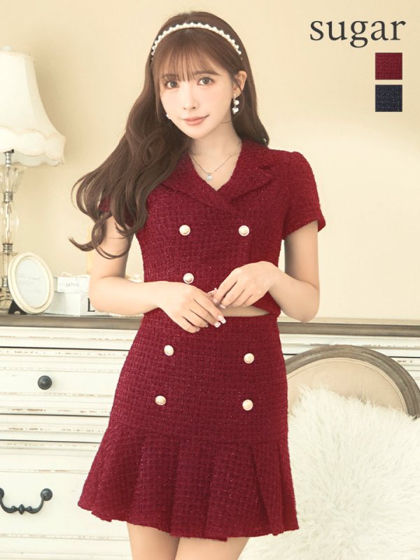 XSサイズあり【an/アン】ラメツイード/ 襟付き/ ボタンデザイン/ 半袖/ 袖あり/ セットアップ/ プリーツ/ ミニドレス/ キャバドレス[OF05] [AOC3573-Burgundy-S231127]