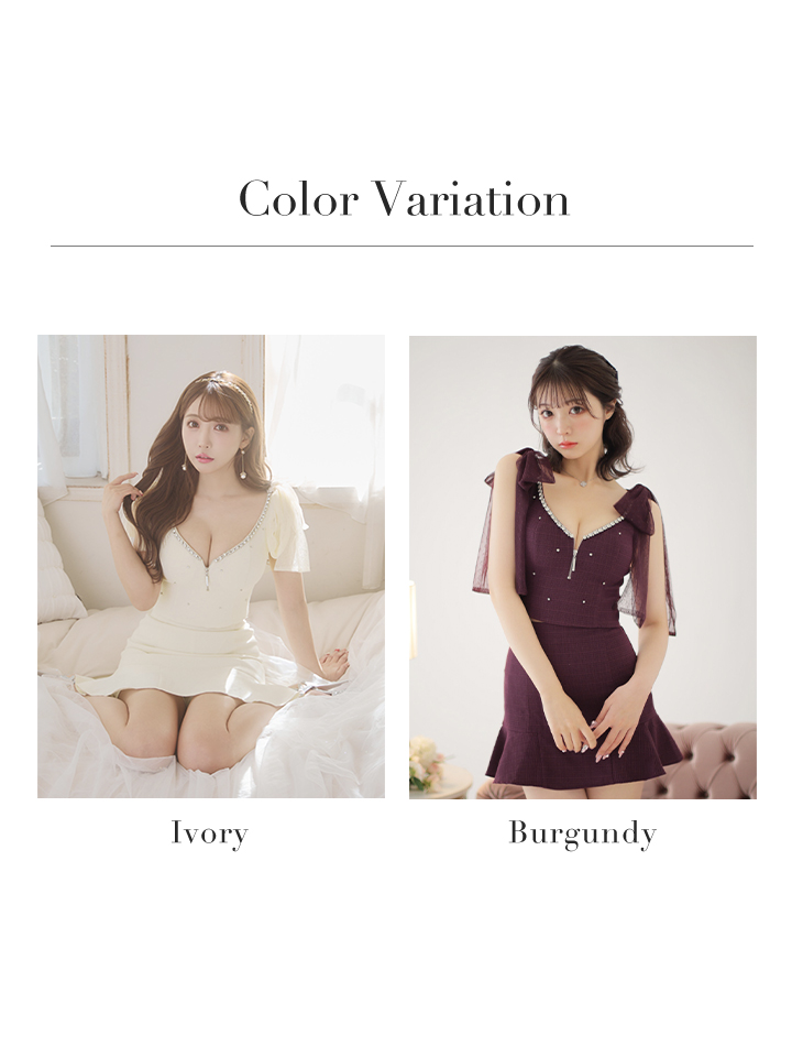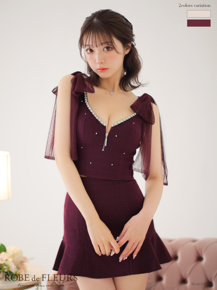 オーガンジー素材のリボンとデコルテビジューの組み合わせがROBEdeFLEURSらしいセットアップドレス。
