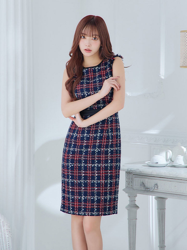 【GINZA COUTURE/銀座クチュール】 ツイード/ ノースリーブ/ タイト/ ワンピース/ ひざ丈/ ミディアムドレス/ キャバドレス[OF2] [LKC33366-NV-S2312]
