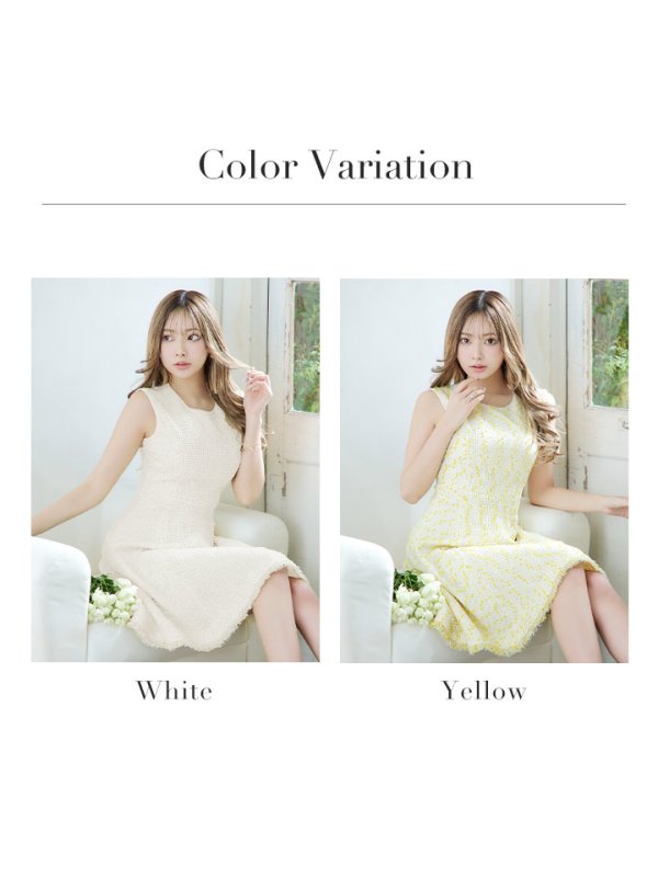 XS-Lサイズあり 【GINZA COUTURE/銀座クチュール】ツイード/ フリンジ/ ノースリーブ/ Aライン/ フレア/ ミディアム丈/ ワンピース/ ミディアムドレス/ キャバドレス[OF2] [LKC23118-YE-S2402]