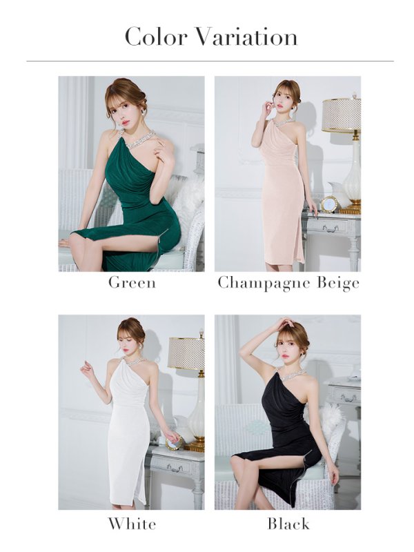 XSサイズあり【Veautt/ヴュート】【OF05】ネックビジュー/ ドレープ/ ファスナー/ スリット/ タイト/ ミディアムドレス/ キャバドレス [VT11232-CHPBE-S240222]